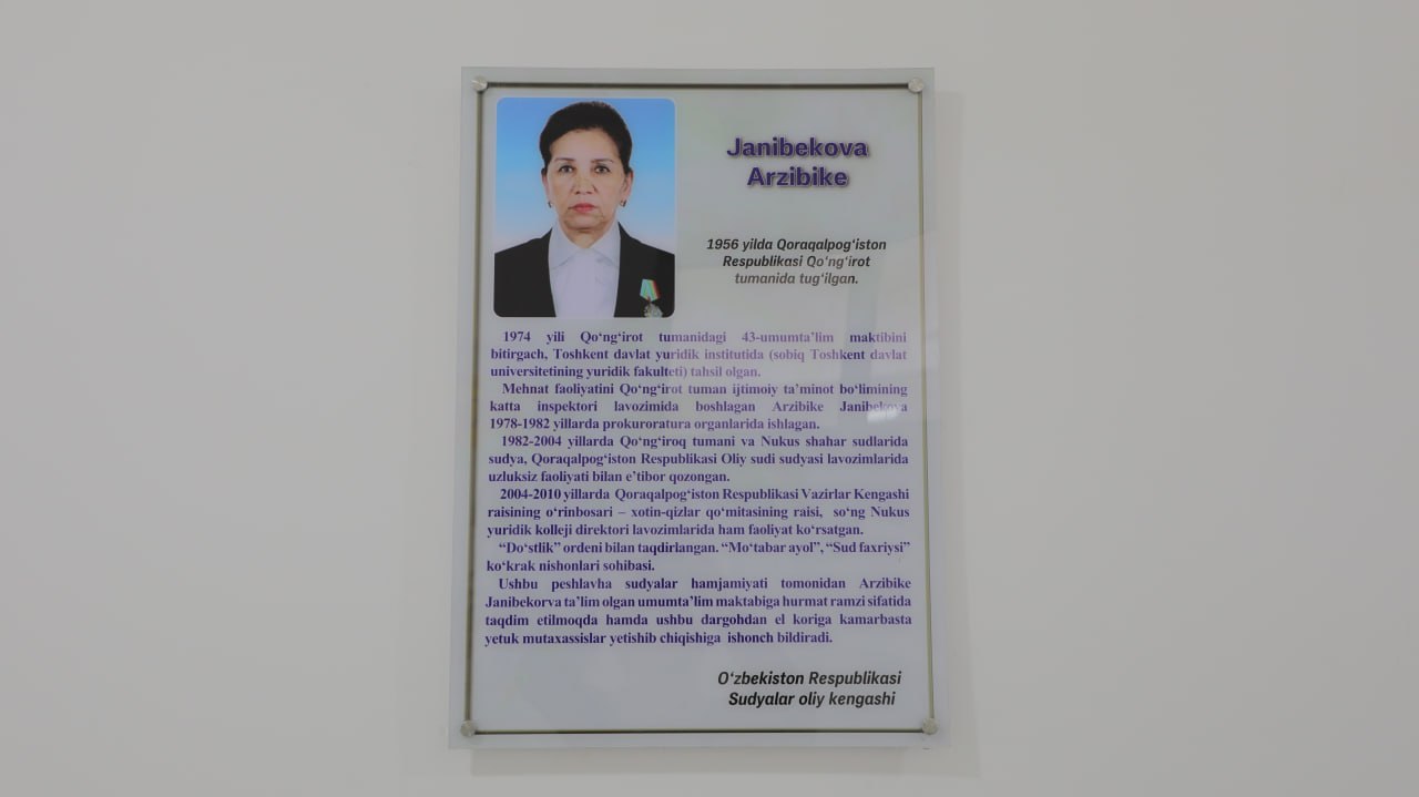 Тадбир доирасида мактаб жамоасига Қорақалпоғистон Республикаси суди томонидан ташаккурнома ва эсдалик совғалари, шунингдек, китоблар жамланмаси топширилди. Шунингдек, Судьялар олий кенгаши томонидан таълим муассасасига Арзибийке Жанибекованинг шарафли ҳаёт йўли, самарали меҳнат фаолиятини акс эттирувчи махсус пешлавҳа тақдим этилди.